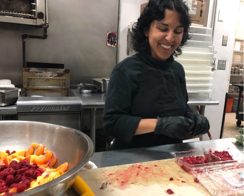 Today, she was working her magic to prepare a farmer’s sausage chowder. This hearty dish was made using ground up sausage, red pepper, carrots and a slew of other vegetables that Eileen received in her donations from the day before. The smells the chowder emitted were intoxicating. Meanwhile, I worked alongside Community Engagement Coordinator, Cassandra DePetrillo, to turn a collection of slightly bruised mandarins, pears, nectarines, raspberries and fresh mint and strawberry yogurt into 25 individual portions of fresh and tasty fruit salad.